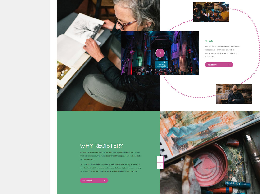 Taking a lead from the brand which utilises mapping and location cues, the CHARTS website design focuses on showcasing the cultural, heritage and arts talent within Argyll and Isles. The overall design is stripped back to allow the spotlight to be on the work and disciplines in action. Subtle flourishes of the brand are used throughout to create a cohesive and harmonious look and feel.